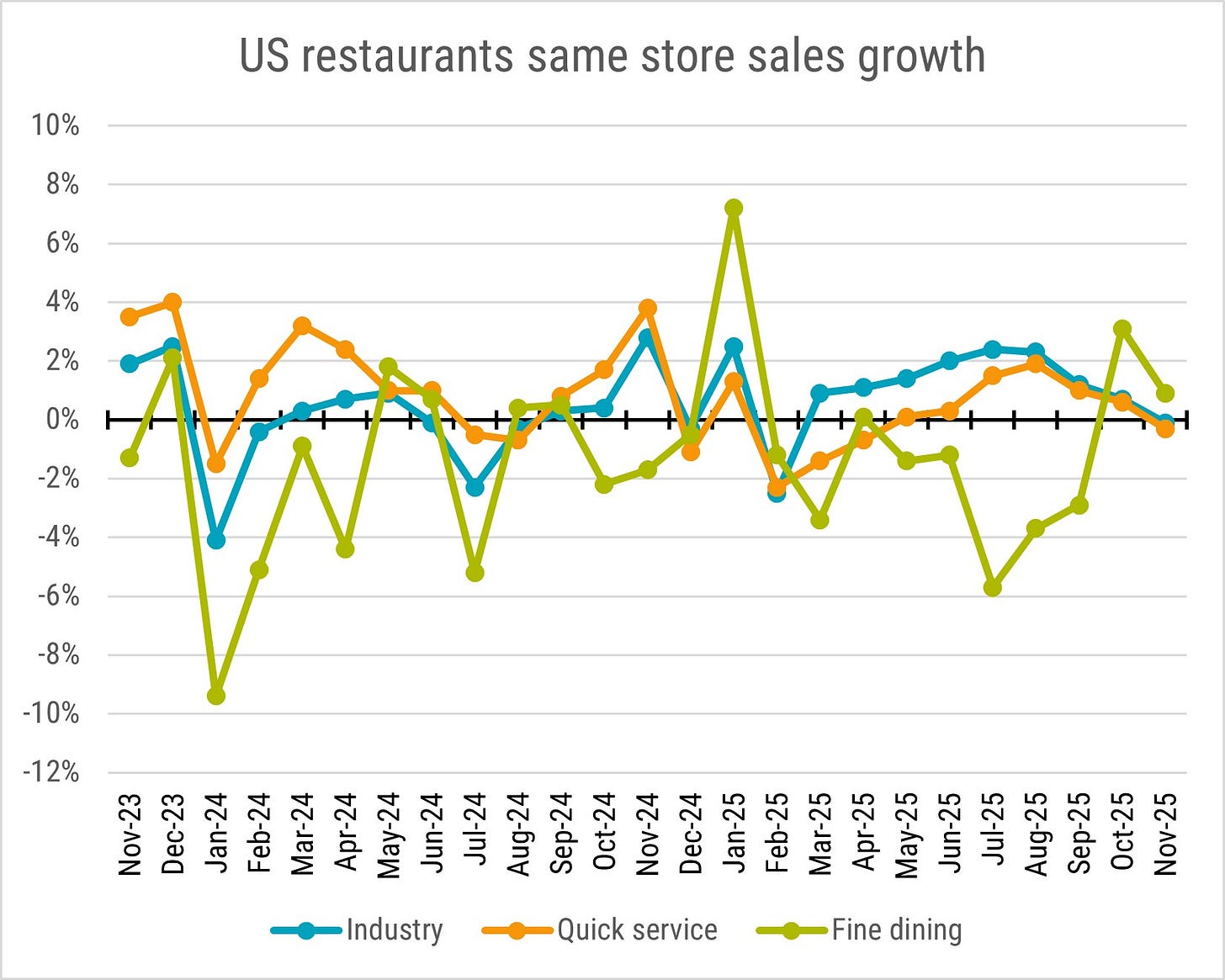 Growth in the US restaurant industry has decelerated and turned negative recently. Restaurants with higher-priced menus are doing better than lower priced fast food, but both are seeing a deceleration in sales growth. Possible drivers of this trend are pressure on low income consumers’ disposable income, menu price hikes, rising penetration of weight loss drugs and more cooking at home to save money.