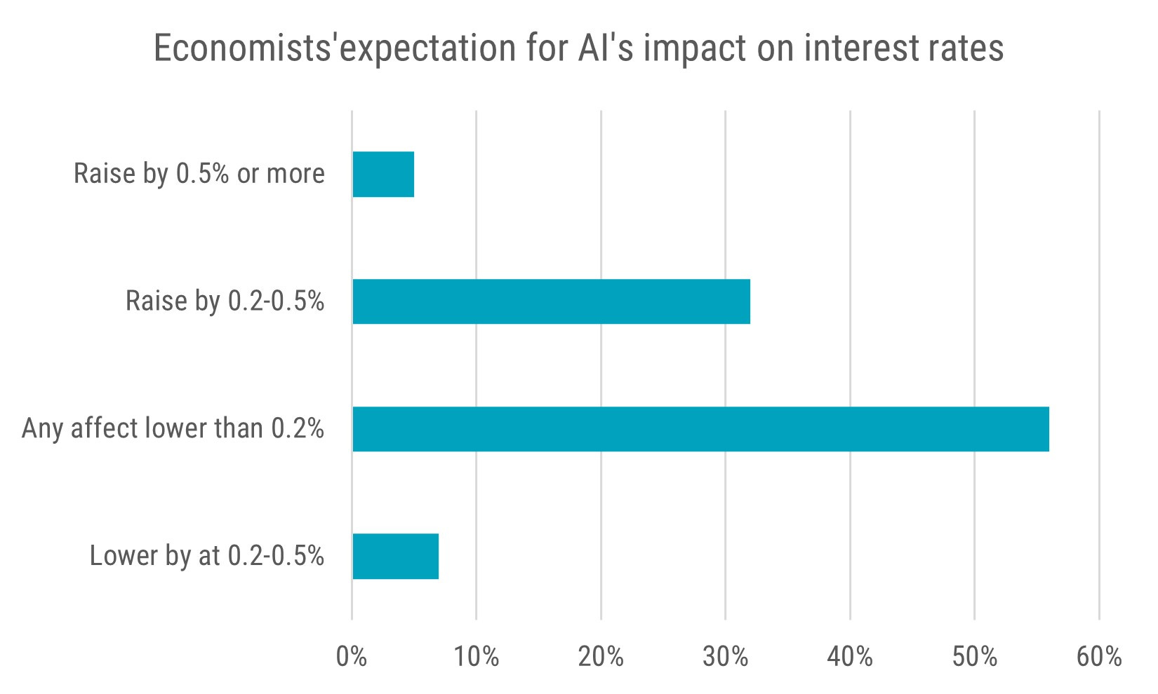 In a relatively short period of time, the market has shifted from being concerned that artificial intelligence was over-hyped, to fearing the technology was so capable that it could automate wide swaths of economic activity. In recent weeks shares of financial services, commercial real estate brokers, freight logistics operators, and even data providers have fallen sharply as concerns spread that AI would disrupt rather than augment those industries. However, at the macro level economists so far appear more sanguine. A recent poll conducted by the University of Chicago’s Clark Center for Global Markets found that nearly 60% of economists say that the likely impact of AI on the neutral real interest rate will be negligible.