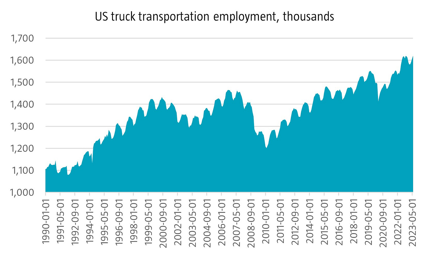 In spite of ongoing headwinds, the trucking industry in the US is picking up speed. Notably, while road freight rates have been down 10% to 15% year on year, against elevated comparisons, investments in trucking equipment have risen sharply in 2023. In the first half of 2023, private fixed investment in transportation equipment in the US rose 42% year on year to USD 617 billion. Furthermore, employment in the trucking industry is rising at a time when there is a 2.6 million driver shortage globally, according to the International Road Transport Union. In the US, employment in the trucking transportation industry in June is up 4.7% from the same period in pre-pandemic 2019. Perhaps autonomous technology will play a bigger role one day, but for the time being, drivers are wanted.