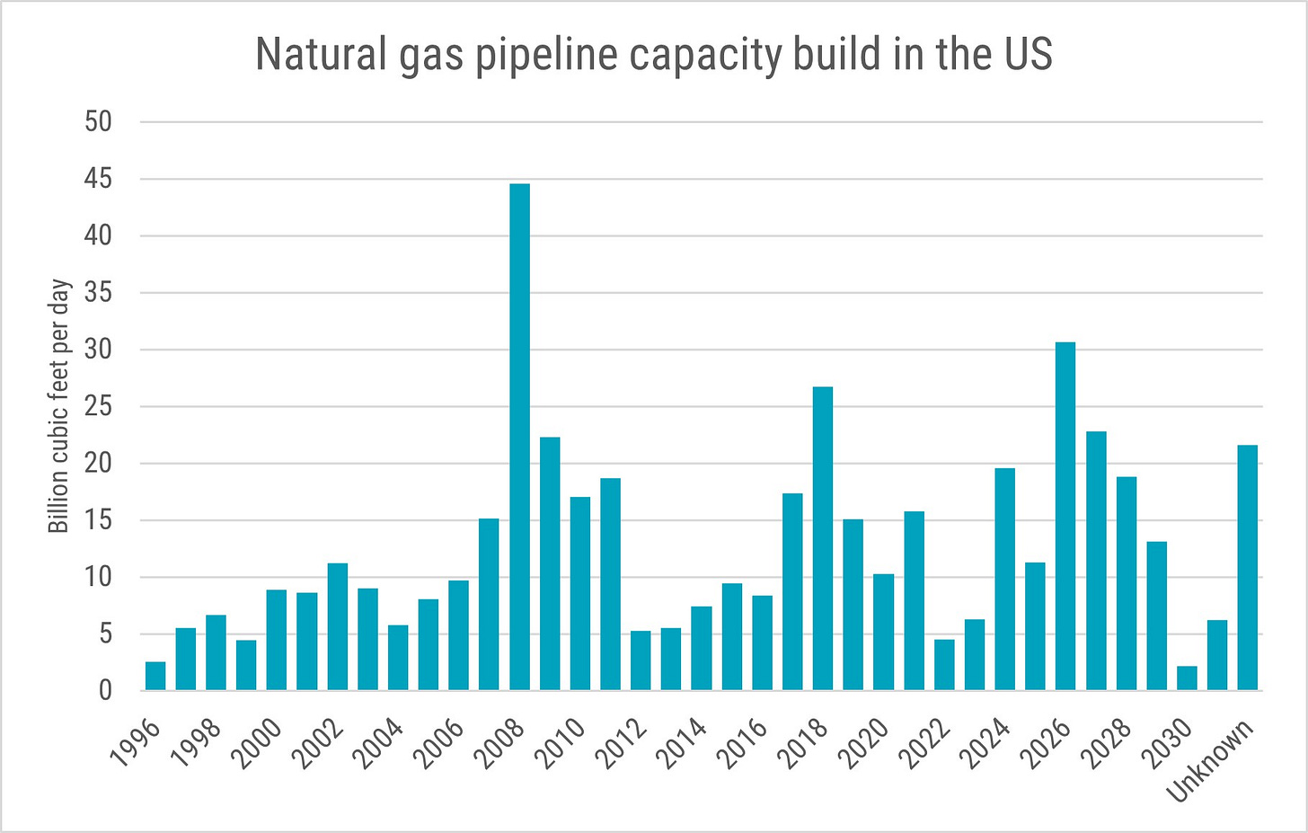 Natural gas is the largest source of energy for US electricity generation, and its share is growing. At the same time, an increasing volume of US natural gas is being liquefied (LNG) and exported, primarily to Asia and Europe. In an earlier Daily Sketch, we highlighted the significant wave of LNG export capacity expected to come online in the US through 2030. To feed these new LNG terminals, substantial investment in pipeline infrastructure is underway. Between 2026 and 2031, 94 billion cubic feet per day of additional pipeline capacity is scheduled to enter service for a total cost of USD 43 billion. Half of that capacity is directly supporting LNG facilities. This underscores how closely US domestic gas markets are becoming linked to global energy demand, which is expected to rise substantially.