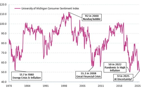 Despite strong economic growth (the Bureau of Economic Analysis reported US GDP rose at a 4.3% annual rate last quarter), consumer sentiment remains low because people focus on immediate financial pressures like high prices (inflation), increased interest rates, and housing costs, which erode purchasing power and income and make consumers feel poorer. This makes the ‘kitchen table’ experience feel worse than macro data suggests. On top of that, continued advances in artificial intelligence makes job security feels less certain. This has created a disconnect where robust spending occurs despite a pessimistic medium term outlook, as consumers prioritize value and struggle with daily affordability despite overall economic strength. Consumers perceive softening job creation, slower hiring, and uncertainty about job security as impacting their confidence. Read more about the outlook for consumer spending, safety and security in this article.