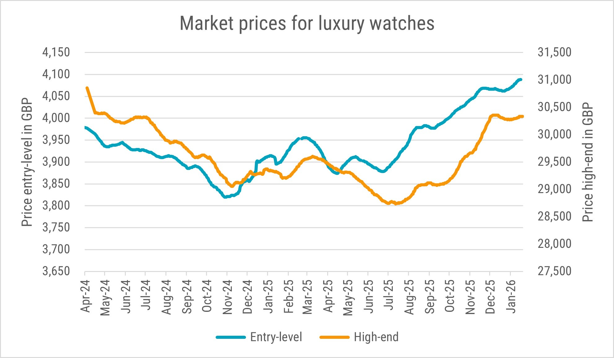 After a pronounced post-pandemic correction, the luxury watch market is exhibiting a broad-based recovery since summer 2025. Both entry-level and high-end price segments have trended upward, reflecting increased demand. Major luxury groups including LVMH and Richemont have reported improving watch sales. As financial markets have strengthened, wealth effects support spending on luxury goods. Secondary-market liquidity has also improved as buyers re-enter the market with a focus on established high-retention brands such as Cartier and Patek Phillipe rather than speculative purchases. Another interesting trend is taking place in the watch market, consumers increasingly favor dress watches over sports watches, the latter was made big by Rolex.
